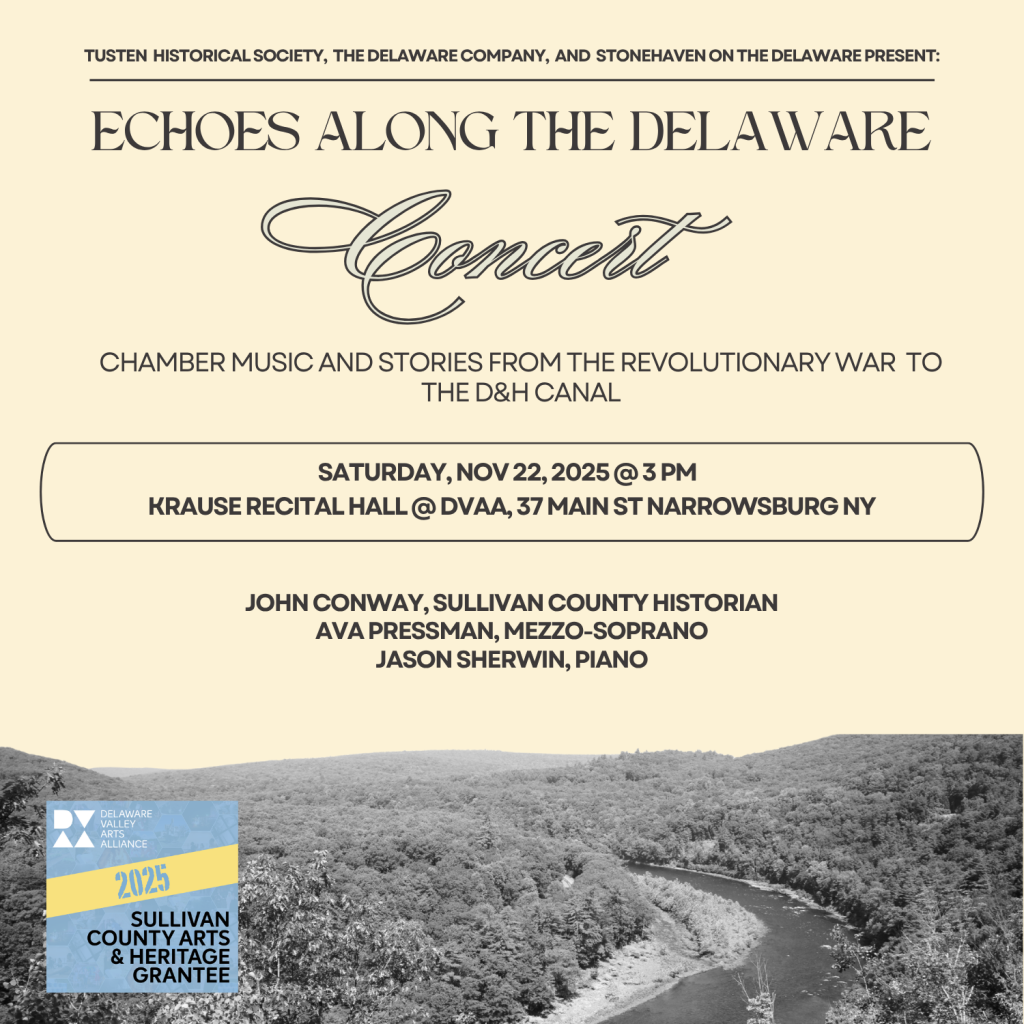 Add to Calendar 11/22/25 3:00pm 11/22/25 05:00PM America/Los_Angeles Echoes Along the Delaware Krause Recital Hall Tusten Historical Society; The Delaware Company; Stone Haven on the Delaware
