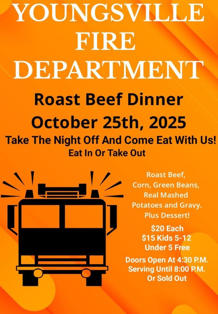 Add to Calendar 10/25/25 10/25/25 America/Los_Angeles Roast Beef Dinner at Youngsville Fire Dept Youngsville Fire Department