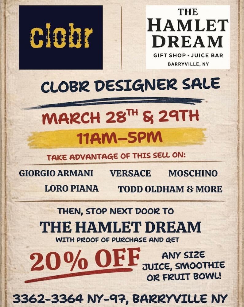 Shop top designer brands at the Clobr Designer Sale, happening March 28 & 29 from 11 AM–5 PM in Barryville. Browse styles from Giorgio Armani, Versace, Moschino, and more, then head next door to The Hamlet Dream to enjoy 20% off juices, smoothies, or fruit bowls with proof of purchase.Shop top designer brands at the Clobr Designer Sale, happening March 28 & 29 from 11 AM–5 PM in Barryville. Browse styles from Giorgio Armani, Versace, Moschino, and more, then head next door to The Hamlet Dream to enjoy 20% off juices, smoothies, or fruit bowls with proof of purchase.