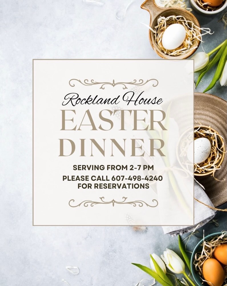 Enjoy a traditional Easter dinner at Rockland House, served from 2–7 PM. Gather with loved ones for a delicious holiday meal in a warm and inviting setting—reservations are recommended, so be sure to call ahead. 607-498-4240