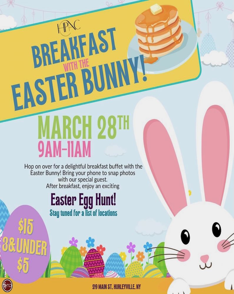 Bring the family to Breakfast with the Easter Bunny on March 28 from 9–11 AM at HPAC in Hurleyville. Enjoy a breakfast buffet, take photos with the Easter Bunny, and stick around for a fun Easter egg hunt. Admission is $15 for adults and $5 for children 3 and under. 🐰🥞