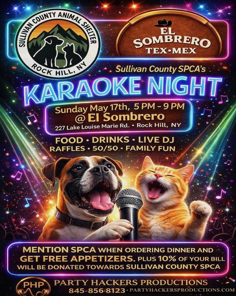 Sing your heart out at Sullivan County SPCA’s Karaoke Night on Sunday, May 17 from 5–9 PM at El Sombrero in Rock Hill. Enjoy food, drinks, raffles, and family fun, […]