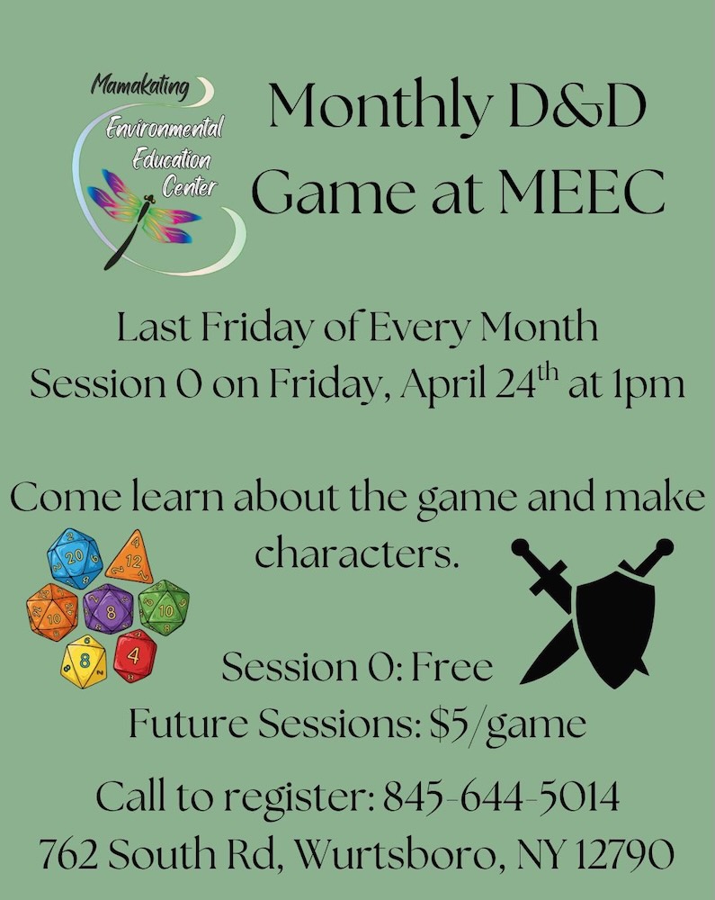 Join a new monthly Dungeons & Dragons group at the Mamakating Environmental Education Center. Session 0 kicks off on Friday, April 24 at 1 pm, where participants can learn the […]