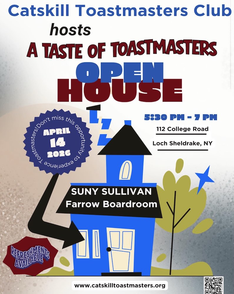 Come join us to see what Toastmasters is all about at our Catskill Toastmasters Open House Event. Enjoy a sampling of our meeting, some light refreshments, meet new people, see […]