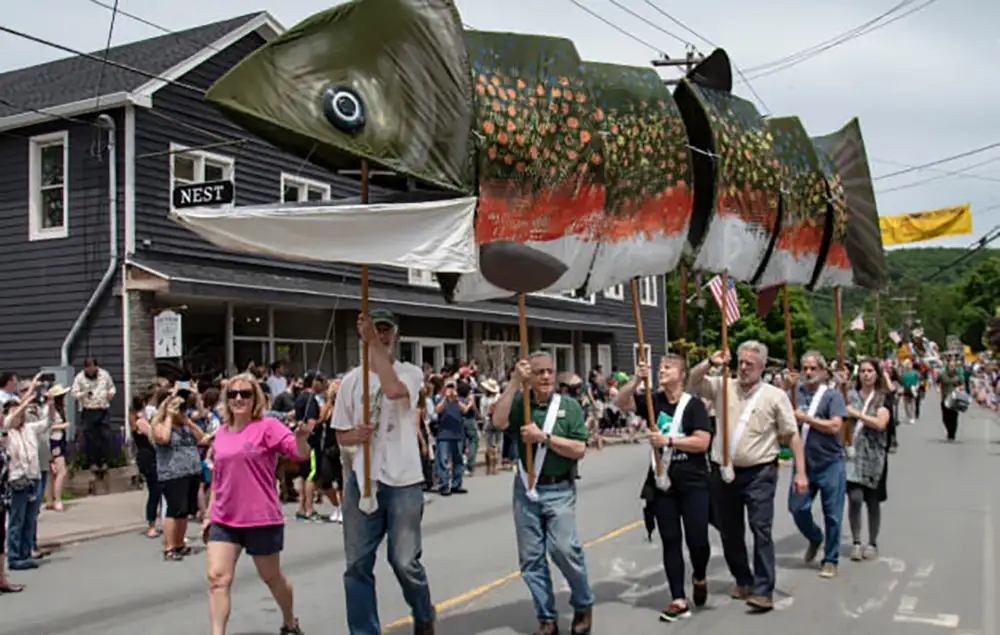 Livingston Manor hosts an annual Trout Parade where the community always gets goofy with a new trout theme every June. This year’s theme? Saturday Trout Fever, yes, disco trout are a thing. And if fish can get funky, then tractors can fandango. Which is exactly what goes down at the annual Tractor Parade in Callicoon where the yearly event t-shirt always sells out. You’ll see why.