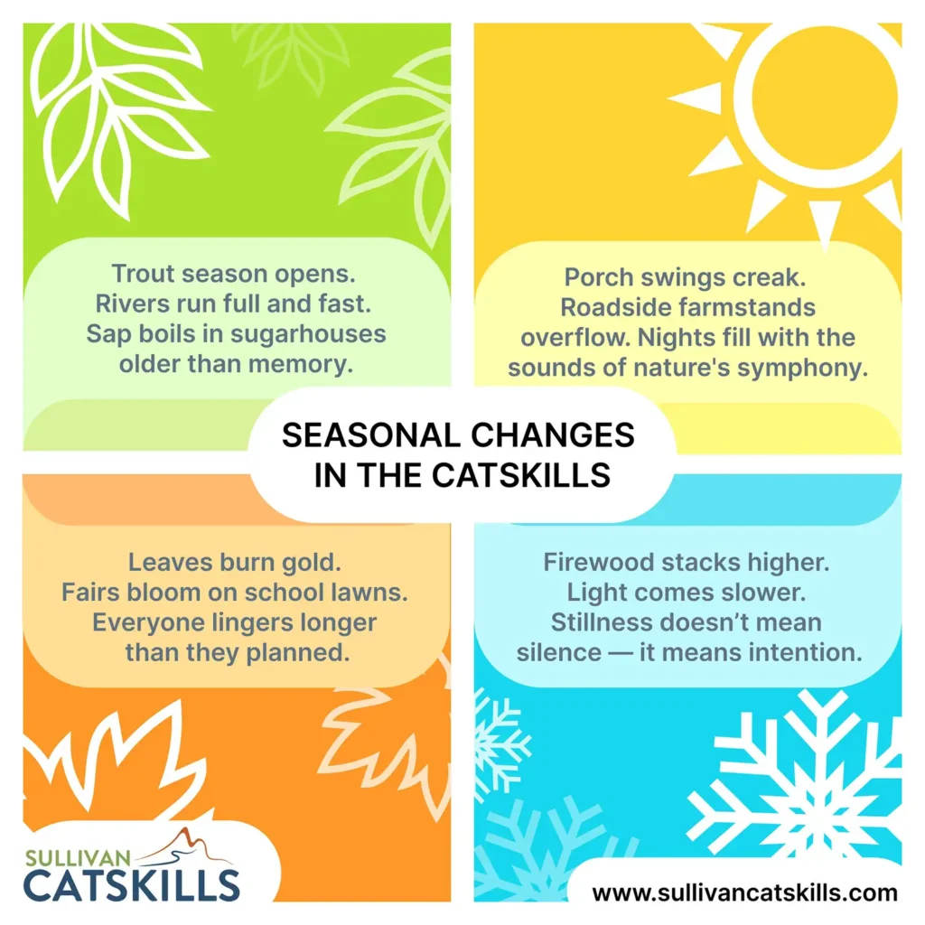 Come winter, Sullivan doesn’t hibernate, it glows. Tree-lightings in towns like Parksville or Liberty bring out generations. You’ll find menorahs glowing beside firetrucks and toddlers sipping cocoa from mugs bigger than their hands. The snow falls soft. The songs come easily. It’s not a production, it’s a reunion.