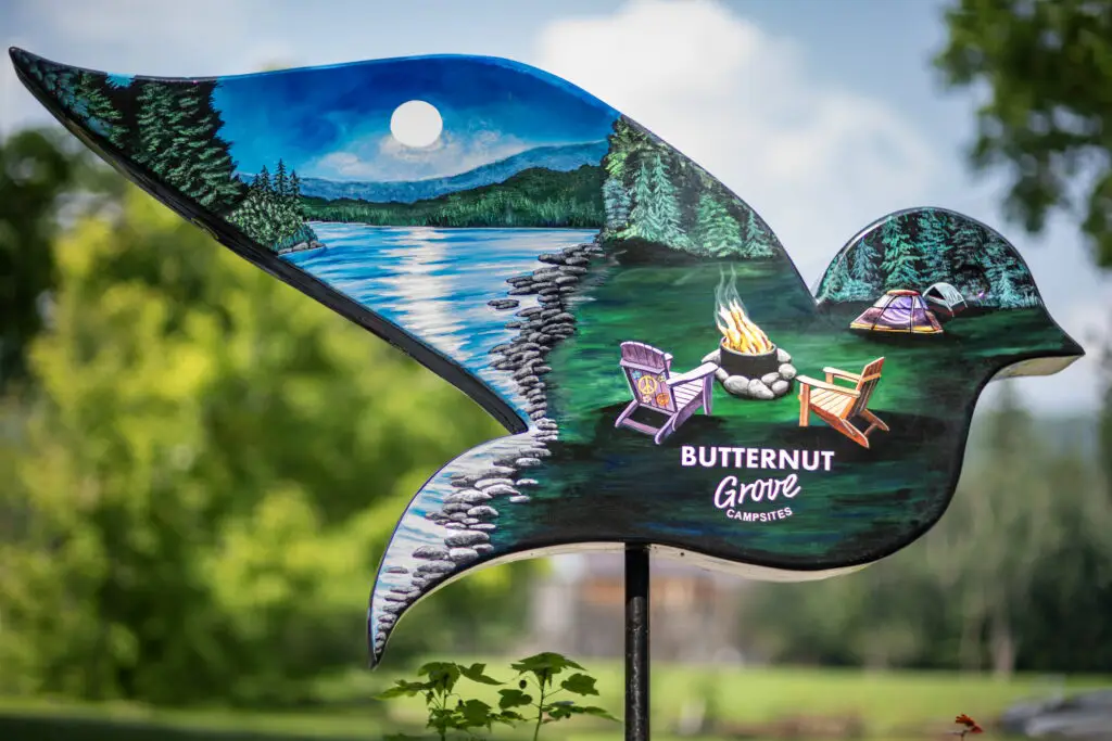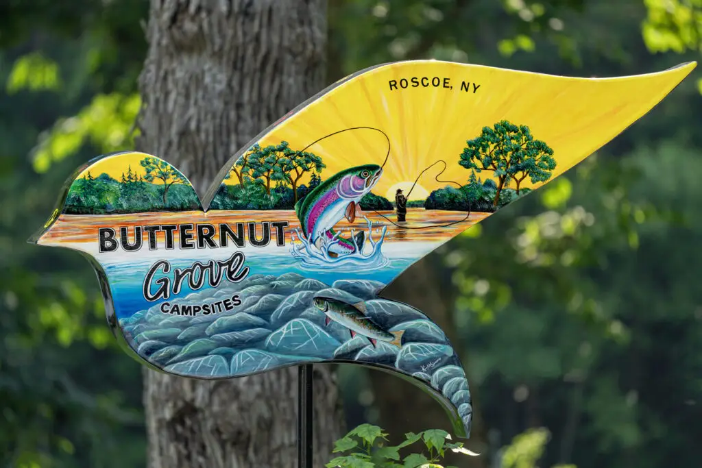 Kim Simons’ dove at Butternut Grove Campsite is a testament to these values and was unveiled during the celebratory anniversary weekend of the 55th Anniversary of Woodstock. Drawing inspiration from the bold, psychedelic art of Peter Max and using a 1969 color palette, Simons has created a piece that captures the vibrant energy of the Woodstock era while also representing Butternut Grove Campsite. The beautiful artwork on the front side of the dove showcases the sun rising above the Beaverkill Lake as an angler tries to catch some trout, while the backside showcases the calm atmosphere of the campsite at night; with two groovy chairs positioned by the campfire in front of the lake.