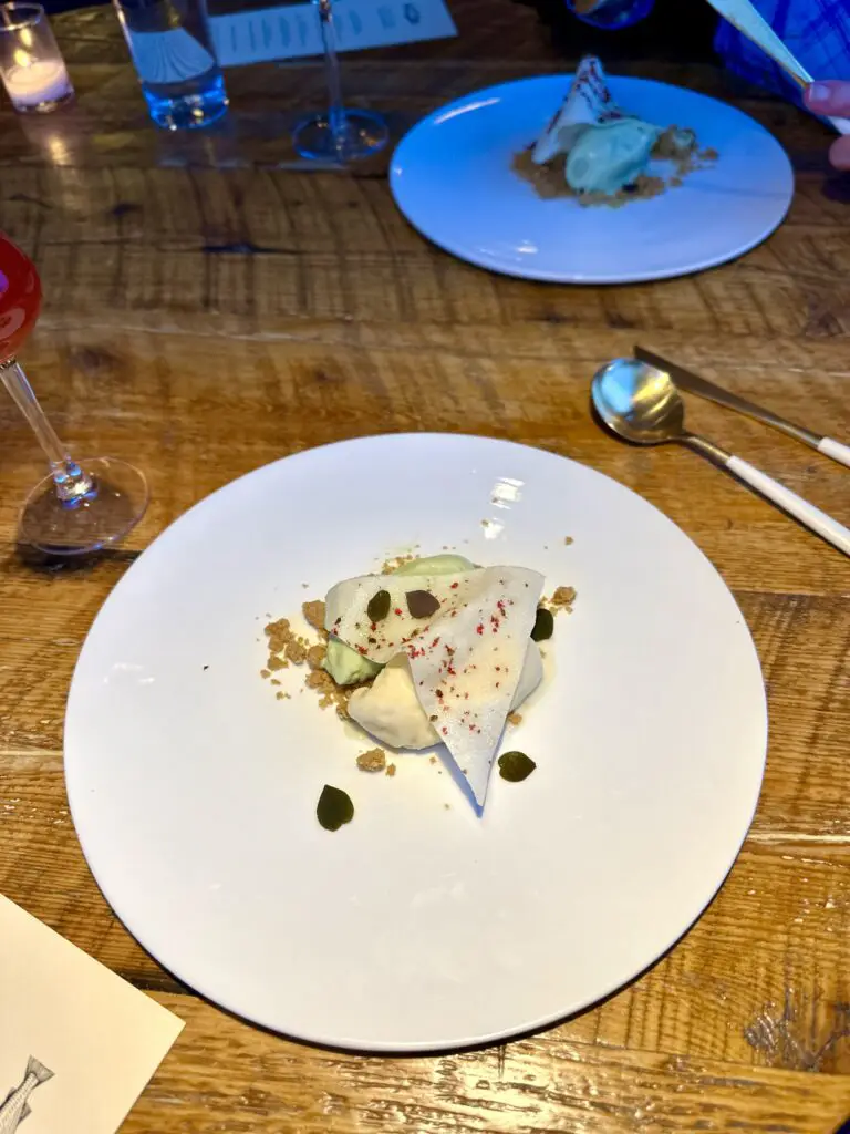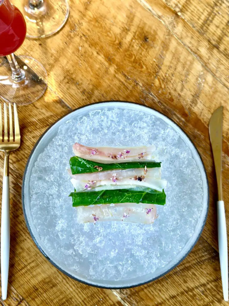 For dessert, you will enjoy Sorrel and Marzipan Ice Cream with coconut crumble underneath and pink peppercorn mochi on top – a creative end to the meal that balances sweet and earthy flavors with great textures in a really bright way.