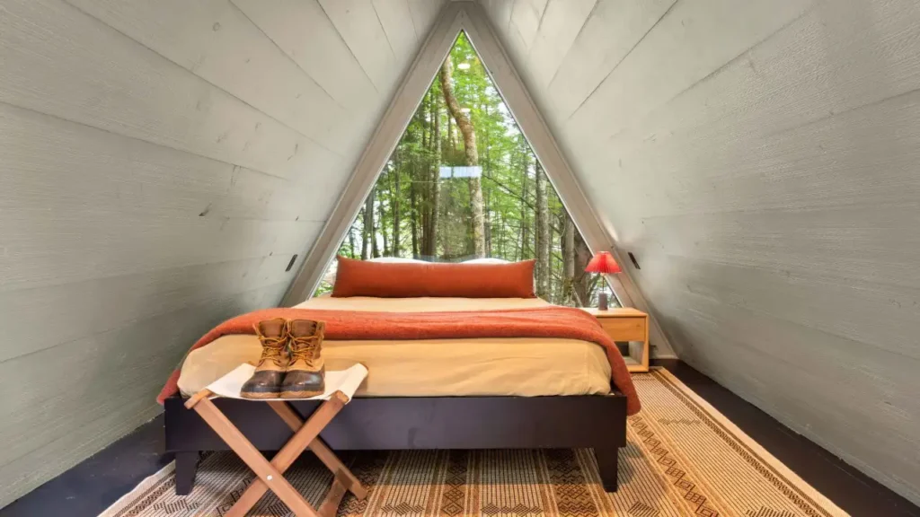 Callicoon Hills hosts a constellation of A-frame cabins across 23 wooded acres. Each triangular hideaway rises with its crown of windows facing sunrise, cradling you in forest light. It’s wild but wired—Wi-Fi and solar lighting mean you can read under the stars or zoom in with mountain views.