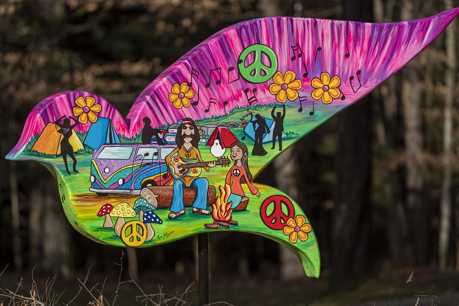 The Dove Trail, developed by the Sullivan Catskills Visitors Association (SCVA), serves as a symbol of the region’s enduring legacy of peace, creativity, and community pride. Each Dove is more than a sculpture; it’s a tribute to the area’s cultural roots and a piece of an expansive trail that draws thousands of visitors. Standing at an impressive 7 feet long and 5 feet high, each Dove is a striking work of art that transforms the landscape, offering inspiration and beauty to all who encounter it.